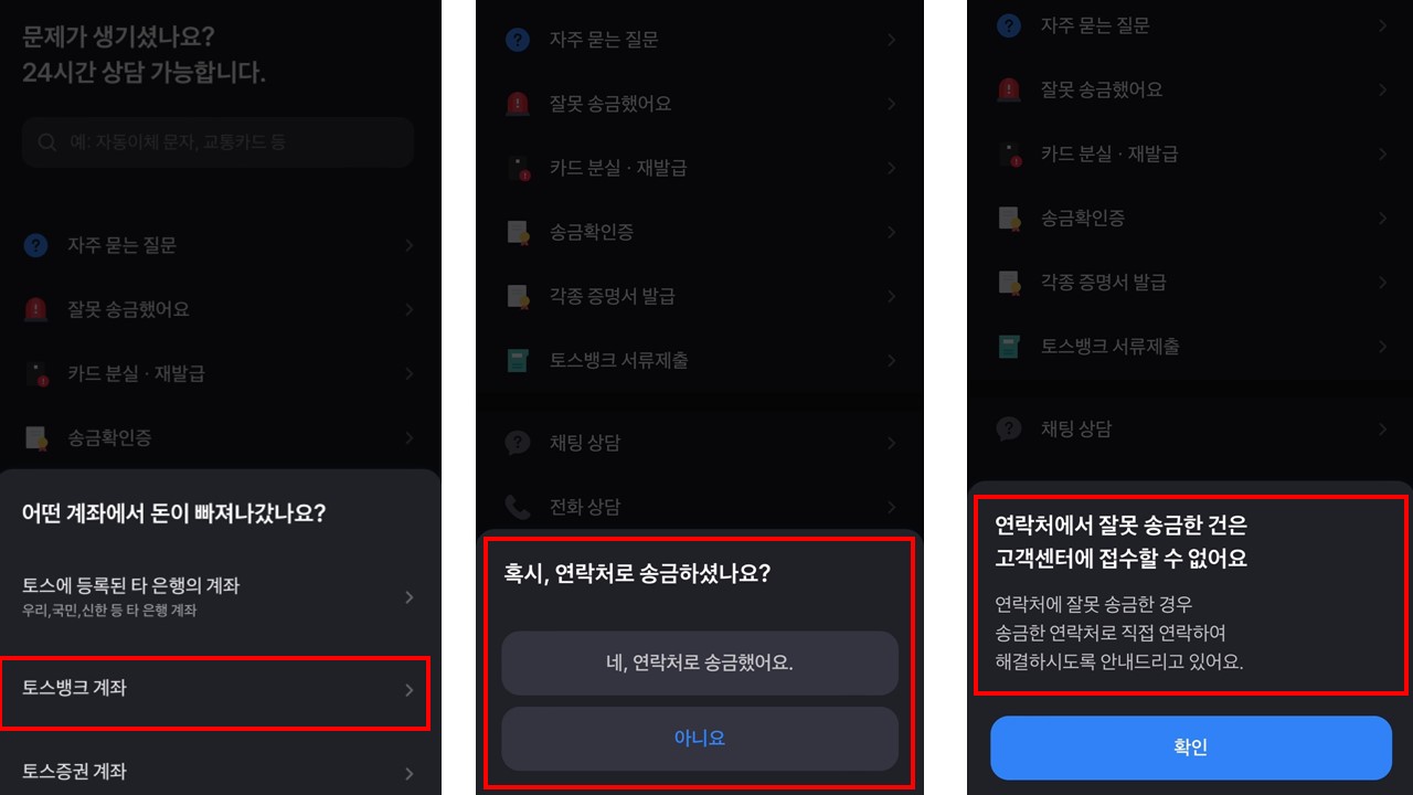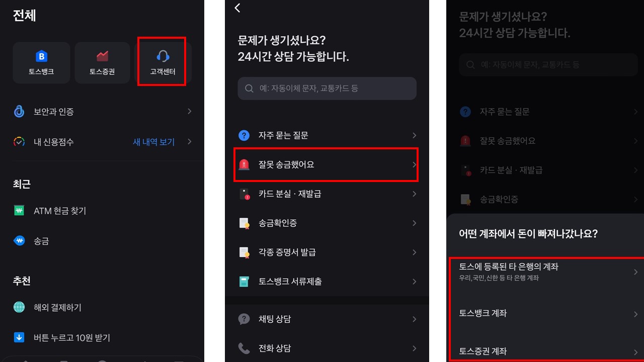 ● 접속방법 : 토스 앱 접속 > 고객센터 > 잘못 송금했어요 클릭 > 빠져나간 금액 클릭