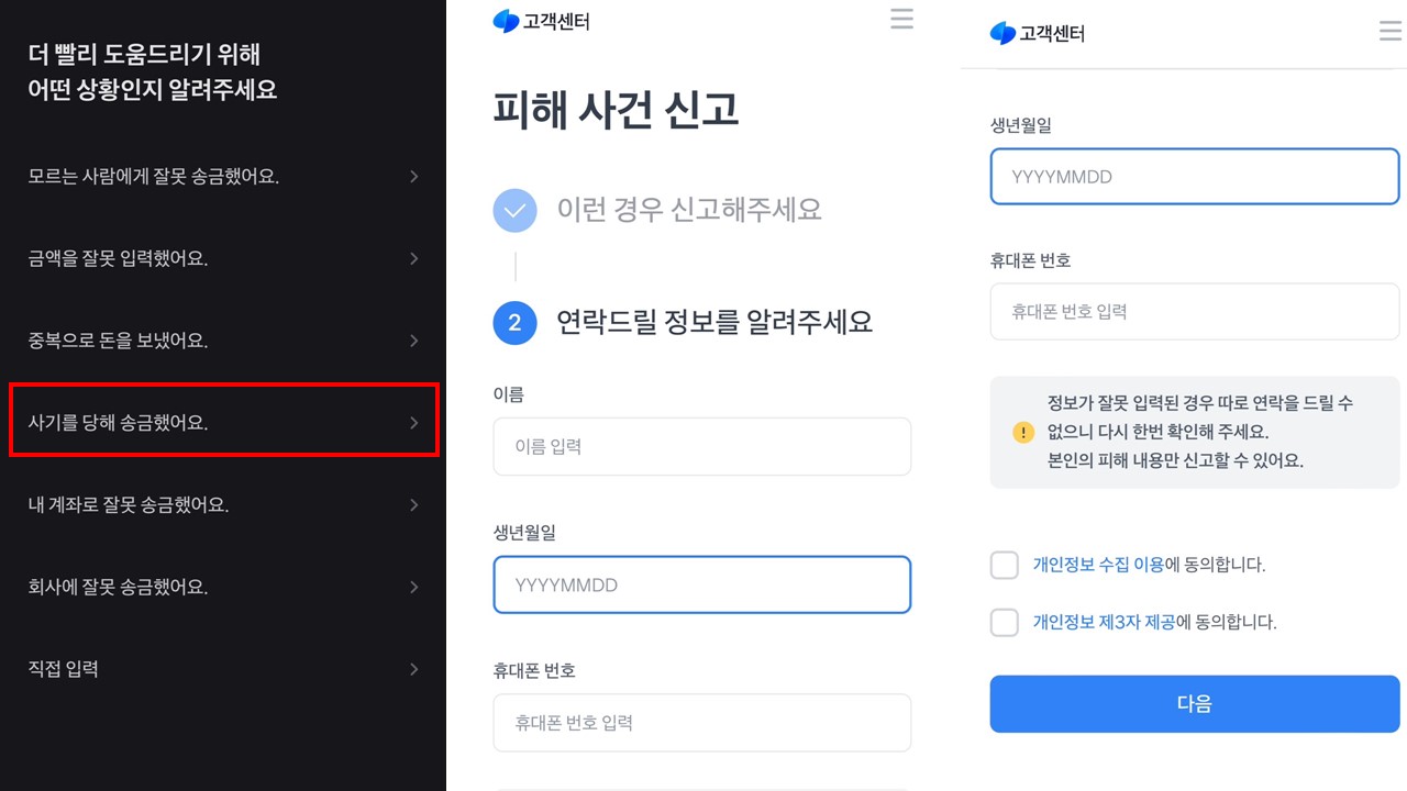 - 사기를 당해 송금했어요 > 개인정보 입력 진행